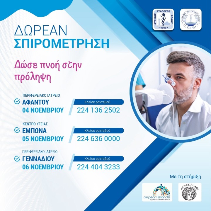 Προληπτική δράση δωρεάν σπιρομετρήσεων πραγματοποιείται στη Ρόδο, με στόχο την ενημέρωση και την ευαισθητοποίηση των πολιτών για την υγεία του αναπνευστικού συστήματος.
