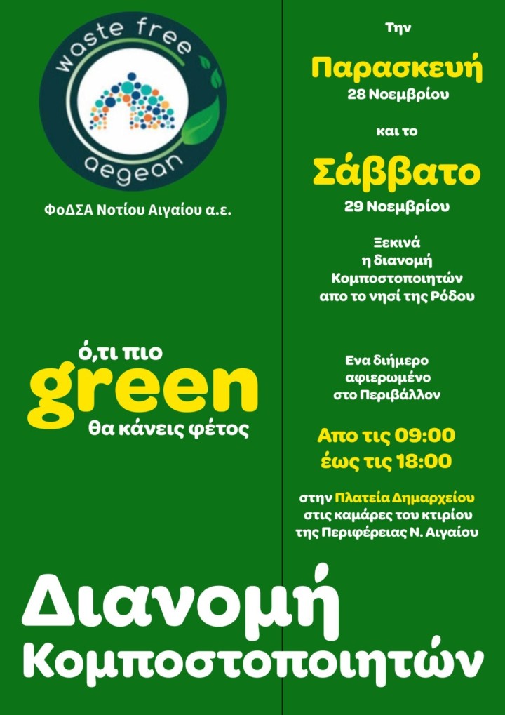 Η αρχή θα γίνει Ρόδο, με ένα διήμερο αφιερωμένο στο περιβάλλον, την κυκλική οικονομία και την ενεργή συμμετοχή των πολιτών. Την ερχόμενη Παρασκευή και το Σάββατο, 28 και 29 Νοεμβρίου, από τις 09:00 έως τις 18:00, στην Πλατεία Δημαρχείου, ο χώρος κάτω από τις καμάρες του Διοικητηρίου της περιφέρειας Νοτίου Αιγαίου, θα μετατραπεί σε ένα ανοιχτό σημείο συνάντησης, ενημέρωσης και διανομής όπου οι πολίτες που υπέβαλαν αίτηση μέσω της ψηφιακής πλατφόρμας www.wastefreeaegean.gr/biowaste και κρίθηκε ότι πληρούν τα κριτήρια που θέτει το Πρόγραμμα, θα έχουν τη δυνατότητα να παραλάβουν τον δικό τους κομποστοποιητή εντελώς δωρεάν και να ενημερωθούν αναλυτικά για τον τρόπο με τον οποίο μπορούν να μετατρέπουν τα οργανικά υπολείμματα της κουζίνας και του κήπου τους σε φυσικό λίπασμα, μειώνοντας σημαντικά των όγκο των απορριμμάτων που θα οδηγηθούν σε ταφή. Σημειώνεται ότι όσοι επιθυμούν να μπουν στο Πρόγραμμα του οικιακού κομποστοποιητή και δεν έχουν υποβάλει ακόμη αίτηση, θα μπορούν να ενημερωθούν και να την υποβάλουν επιτόπου, παραλαμβάνοντας άμεσα τον δικό τους!