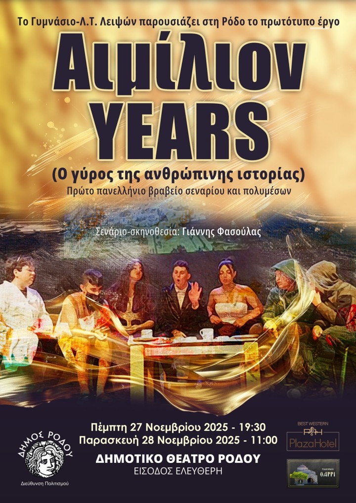 Η Θεατρική Ομάδα του Γυμνασίου με Λυκειακές Τάξεις Λειψών και η Διεύθυνση Πολιτισμού του δήμου Ρόδου παρουσιάζουν ένα πρωτότυπο έργο που συνδυάζει την ιστορία με τη φαντασία και τον ενθουσιασμό της συμμετοχής του κοινού: «Αιμίλιον Years: Ο Γύρος της Ανθρώπινης Ιστορίας».