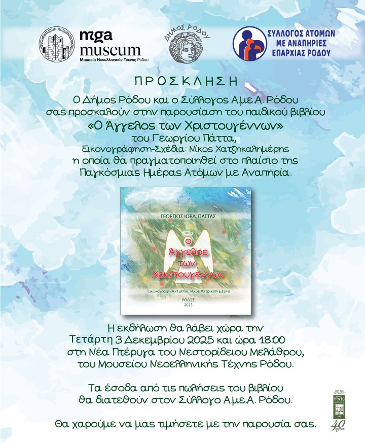 Ο δήμος Ρόδου, ο Σύλλογος Α.με.Α. Ρόδου και το Μουσείο Νεοελληνικής Τέχνης Ρόδου έχουν την τιμή να προσκαλέσουν το κοινό της Ρόδου στην επίσημη παρουσίαση του νέου παιδικού βιβλίου του Γεωργίου Πάττα με τίτλο «Ο Άγγελος των Χριστουγέννων», σε εικονογράφηση και σχεδίαση του Νίκου Χατζηκαλημέρη.