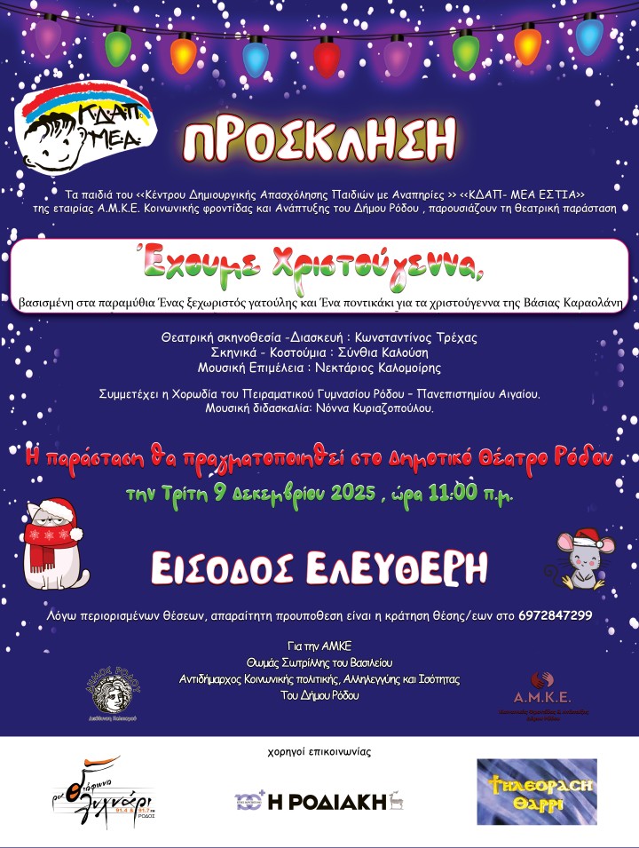 Η παράσταση, βασισμένη σε ελεύθερη διασκευή των παραμυθιών «Ένας ξεχωριστός γατούλης» και «Ένα ποντικάκι για τα Χριστούγεννα» της Βάσιας Καραολάνη θα παρουσιαστεί την Τρίτη 9 Δεκεμβρίου 2025, στις 11:00 π.μ., από τα παιδιά του ΚΔΑΠ-ΜΕΑ «ΕΣΤΙΑ» της ΑΜΚΕ Κοινωνικής Φροντίδας και Ανάπτυξης του δήμου Ρόδου.