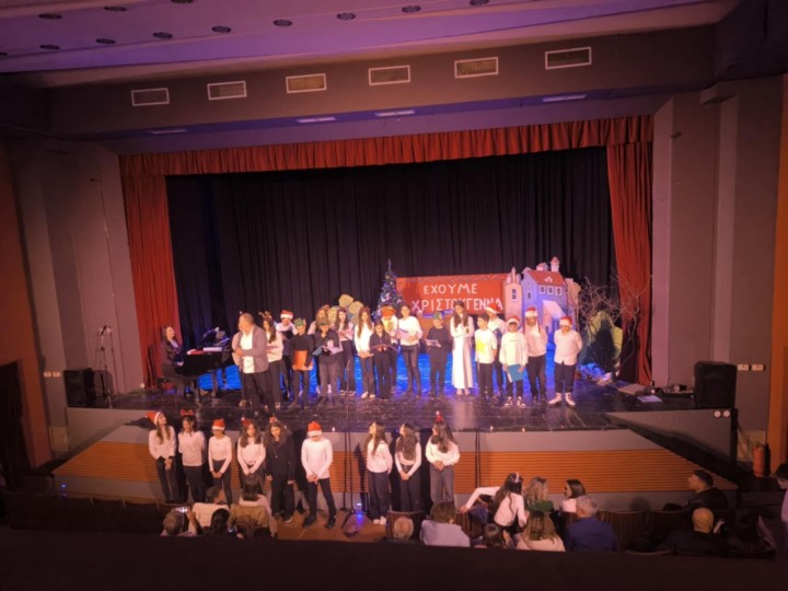 Κατόπιν, τη σκυτάλη πήρε η χορωδία του σχολείου μας, η οποία μας ταξίδεψε με χριστουγεννιάτικα τραγούδια και αγαπημένες μελωδίες, δημιουργώντας μια ζεστή και συγκινητική ατμόσφαιρα. Ξεχωριστή θέση στο πρόγραμμα είχε η συνοδεία μαθητών με λύρα, του Ευάγγελου Καραταπάνη, του Γιώργου Κυριαζάκου και του καλεσμένου μας Χρησταντώνη Κουτσάκη, μαθητή του Μουσικού Σχολείου Ρόδου της οποίας ο ήχος, λιτός και βαθιά εκφραστικός, γέμισε το θέατρο και χάρισε μια ιδιαίτερη, σχεδόν μυσταγωγική χροιά στη βραδιά. Η σκηνή γέμισε παιδικές φωνές, ενθουσιασμό και αγάπη για τη μουσική, ενώ το κοινό ανταποκρίθηκε με θερμό χειροκρότημα, επιβραβεύοντας την προσπάθεια και το ταλέντο των παιδιών. Τη χορωδία συνόδευε στο πιάνο η μουσικός του σχολείου μας κα Νόννα Κυριαζοπούλου μαζί με τους μαθητές του σχολείου μας, Κάτια Ταβλαρίδου και Συμεών Χαπίπη.