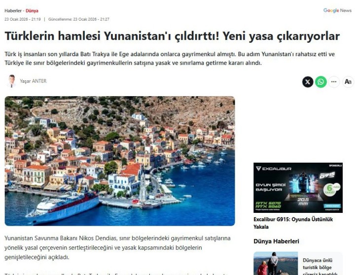 Με τίτλο «Η κίνηση των Τούρκων που «τρέλανε» την Ελλάδα! Θεσπίζουν νέο νόμο», η Sozcu υποστηρίζει ότι «Τούρκοι επιχειρηματίες αγόρασαν τα τελευταία χρόνια δεκάδες ακίνητα στη Δυτική Θράκη και στα νησιά του Αιγαίου» και ότι η εξέλιξη αυτή «ενόχλησε την Ελλάδα, η οποία αποφάσισε απαγορεύσεις και περιορισμούς στην πώληση ακινήτων σε παραμεθόριες περιοχές με την Τουρκία».