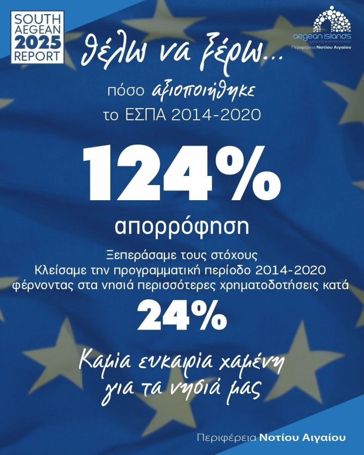 "Οι πολίτες θέλουν να ξέρουν και εμείς το ίδιο. Θέλουμε πολίτες που ξέρουν, γιατί για εμάς ο απολογισμός δεν είναι τυπική διαδικασία. Είναι δέσμευση διαφάνειας. Να παρουσιάζουμε τι κάναμε, που στοχεύσαμε και τι πετύχαμε. Το 2025, έκλεισε διοικητικά και οικονομικά, το ΕΣΠΑ 2014-2020. Η πρώτη ερώτηση που προκύπτει σε κάθε τέτοια περίσταση είναι μία: αξιοποιήθηκαν οι πόροι που ήταν διαθέσιμοι; Απαντάμε: και με το παραπάνω. Στο 124% κλείσαμε το ΕΣΠΑ 2014-2020 και αυτό γιατί δεν θέλουμε να πάει χαμένη καμία ευκαιρία για τα νησιά μας. Γιατί, αυτό είναι οι Ευρωπαϊκοί πόροι: ευκαιρίες. Και δουλεύουμε με πάθος για να αξιοποιήσουμε τις ευκαιρίες".