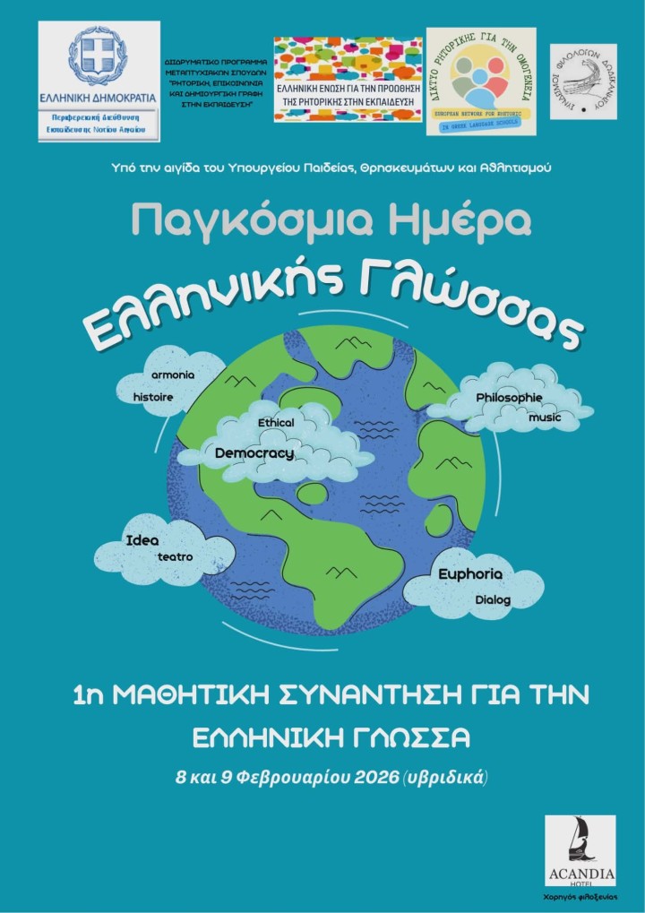 Με αφορμή τον παγκόσμιο εορτασμό για την Ελληνική Γλώσσα στις 9 Φεβρουαρίου, υπό την αιγίδα του ΥΠΑΙΘΑ, η Περιφερειακή Διεύθυνση Εκπαίδευσης Νοτίου Αιγαίου, μέσω της Περιφερειακής επόπτριας Ποιότητας, Καφαλούκου Κωνσταντίνας και της επόπτριας Ποιότητας Δευτεροβάθμιας Εκπαίδευσης Δωδεκανήσου, Μουλά Ευαγγελίας, σε συνεργασία με τις/τους συμβούλους Εκπαίδευσης Φιλολόγων, Καλαούζη Κωνσταντίνα, Παλάσκα Σωτήρη, Κιούση Δήμητρα και Βασιλείου Δημήτριο, συνδιοργανώνει με την Ελληνική Ένωση για την Προώθηση της Ρητορικής στην Εκπαίδευση και με τη συνεργασία του Δικτύου Σχολείων “ASPnet UNESCO” και του Συνδέσμου Φιλολόγων Δωδεκανήσου, καθώς και με την επιστημονική υποστήριξη του Διιδρυματικού Προγράμματος Μεταπτυχιακών Σπουδών «Ρητορική, Επικοινωνία και Δημιουργική Γραφή στην Εκπαίδευση»-Ε.Κ.Π.Α.-Παν. Δυτ. Μακεδονίας, την 1η ΜΑΘΗΤΙΚΗ ΣΥΝΑΝΤΗΣΗ ΓΙΑ ΤΗΝ ΕΛΛΗΝΙΚΗ ΓΛΩΣΣΑ, στις 8 και 9 Φεβρουαρίου 2026 με υβριδική μορφή.