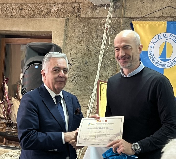 Ο Πρόεδρος του ΑΣΙΑΘΡ, Σταμάτης Σταύρας, απένειμε τιμητική πλακέτα στη Σημαιοφόρο του Λιμενικού Σώματος κα Αθανασία Βρέκου, για τη βοήθεια και τη συμμετοχή της ως εκπαιδευτή στη Σχολή.