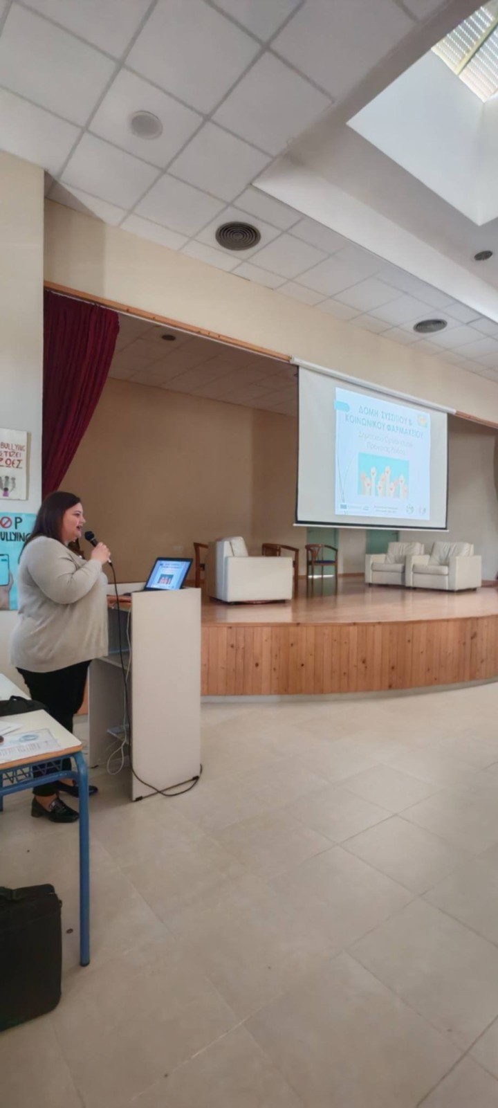 Έπειτα, τη σκυτάλη έλαβε η Δέσποινα Περάκη κοινωνική λειτουργός – συντονίστρια της Δομής Συσσιτίου, η οποία ανέδειξε το ρόλο και τη συνεισφορά του Συσσιτίου και του Κοινωνικού Φαρμακείου στον τοπικό πληθυσμό. Η Δομή Συσσιτίου συλλέγει παρασκευάζει, συσκευάζει και διανέμει καθημερινά δύο γεύματα σε ωφελούμενους ευάλωτων ομάδων, ενώ το Κοινωνικό Φαρμακείο συγκεντρώνει, αποθηκεύει και διανέμει φάρμακα και άλλα είδη φροντίδας υγείας σε άπορους, άνεργους και ευπαθείς ομάδες του πληθυσμού.