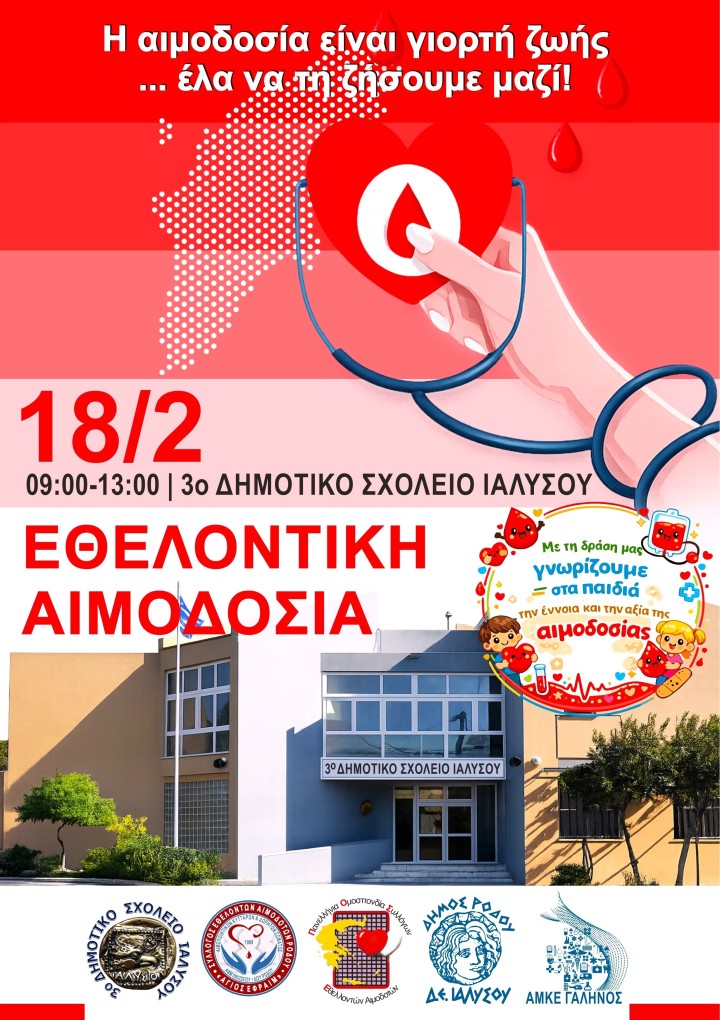 Το 3ο Δημοτικό Σχολείο Ιαλυσού μετατρέπεται σε «Γέφυρα Ζωής», καθώς οι μαθητές των Ε’ και ΣΤ’ τάξεων μαζί με τους εκπαιδευτικούς τους διοργανώνουν εθελοντική αιμοδοσία την Τετάρτη 18 Φεβρουαρίου, από τις 09:00 έως τη 13:00.
