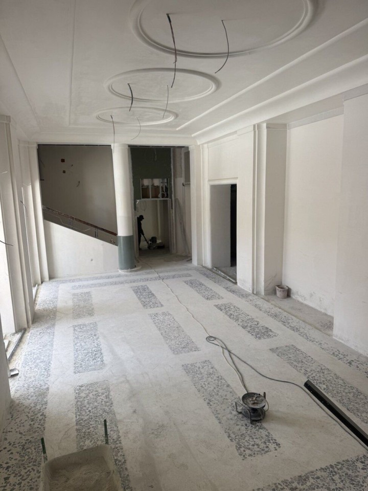 Παράλληλα, ολοκληρώνεται η κατασκευή νέου μωσαϊκού, με την ίδια τεχνοτροπία του ιταλικού μωσαϊκού της αρχικής περιόδου. Όπου ήταν εφικτό, διατηρήθηκε το υφιστάμενο παλαιό υλικό. Η απόδοση είναι τόσο προσεκτική, ώστε η διάκριση παλαιού και νέου να γίνεται με δυσκολία. Παράλληλα έχουν ξεκινήσει τα πρώτα «χέρια» χρωματισμών στο εσωτερικό, διαμορφώνοντας πλέον καθαρή εικόνα της τελικής αισθητικής.