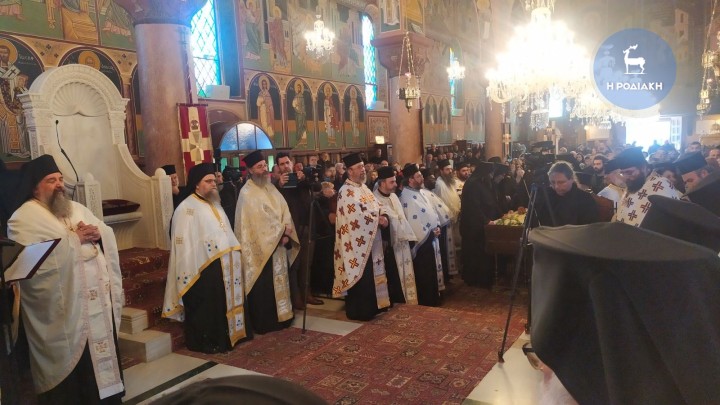 Οι σημαίες κυμάτιζαν χτες μεσίστιες τόσο στο Δημαρχιακό Μέγαρο όσο και στον Βωμό της Πατρίδας, ενώ μεγάλος αριθμός πιστών κατέκλυσε και τους χώρους γύρω από τον ναό. Στην είσοδό του είχαν τοποθετηθεί τα στεφάνια του προέδρου της Κυπριακής Δημοκρατίας Νίκου Χριστοδουλίδη, του βουλευτή Γιάννη Παππά, του δημάρχου Ρόδου Αλέξανδρου Κολιάδη, του δήμου Πάτμου, του δήμου Αγαθονησίου, και της Πατμιάδας Εκκλησιαστικής Σχολής.