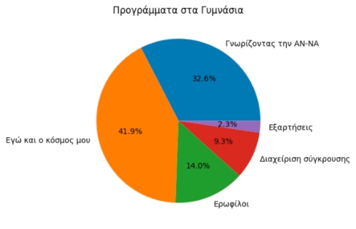 Στα Γυμνάσια πραγματοποιήθηκαν 43 δράσεις δυο και τριών συναντήσεων, (1145 μαθητές) με κυρίαρχα εκπαιδευτικά προγράμματα :