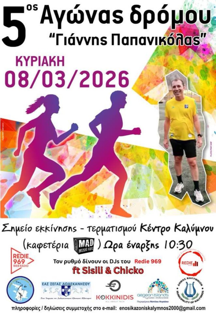 Άλλος ένας αγώνας δρόμου θα διεξαχθεί στην Κάλυμνο την Κυριακή 8 Μαρτίου στις 10.30 με διοργανωτές την Ένωση Καζώνη-Κάλυμνος 2000, την ΕΑΣ Δωδεκανήσου, τον Δήμο και το Επαρχείο Καλύμνου. Η διοργάνωση αυτή είναι αφιερωμένη στη μνήμη του ιατρού κι αθλητή Γιάννη Παπανικόλα με αγωνίσματα κι αποστάσεις για κάθε ηλικιακή κατηγορία.