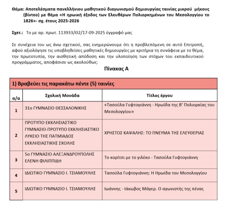 Με ιδιαίτερη χαρά και υπερηφάνεια ανακοινώνουμε ότι το Πρότυπο Εκκλησιαστικό Γυμνάσιο – Πρότυπο Εκκλησιαστικό Λύκειο της Πατμιάδας Εκκλησιαστικής Σχολής κατέκτησε την 2η θέση στον Πανελλήνιο Μαθητικό Διαγωνισμό Δημιουργίας Ταινίας Μικρού Μήκους με θέμα «Η ηρωική έξοδος των Ελευθέρων Πολιορκημένων του Μεσολογγίου το 1826». Με ιδιαίτερη χαρά και υπερηφάνεια ανακοινώνουμε ότι το Πρότυπο Εκκλησιαστικό Γυμνάσιο – Πρότυπο Εκκλησιαστικό Λύκειο της Πατμιάδας Εκκλησιαστικής Σχολής κατέκτησε την 2η θέση στον Πανελλήνιο Μαθητικό Διαγωνισμό Δημιουργίας Ταινίας Μικρού Μήκους με θέμα «Η ηρωική έξοδος των Ελευθέρων Πολιορκημένων του Μεσολογγίου το 1826».