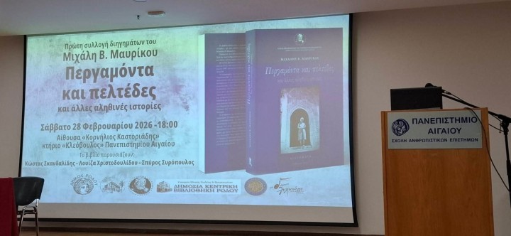 Στην κατάμεστη αίθουσα ΚΟΡΝΗΛΙΟΣ ΚΑΣΤΟΡΙΑΔΗΣ στο κτήριο ΚΛΕΟΒΟΥΛΟΣ του Πανεπιστημίου Αιγαίου, το Σάββατο το απόγευμα, 28 Φεβρουαρίου 2026 σε μια βραδιά λόγου, εικόνων, αναμνήσεων και πολιτισμού έγινε η παρουσίαση του βιβλίου του Μιχάλη Μαυρίκου από τους Καθηγητές του Πανεπιστημίου της πόλης μας, την κα Λουίζα Χριστοδουλίδου και τον κ Σπύρο Συρόπουλο με τίτλο: