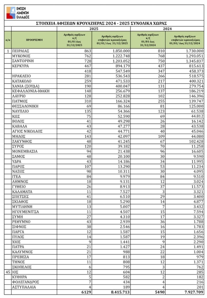 Κατά το 2025 καταγράφηκαν συνολικά 6.129 προσεγγίσεις κρουαζιερόπλοιων στα ελληνικά λιμάνια, έναντι 5.490 αφίξεων το 2024, σημειώνοντας αύξηση 11,7%.