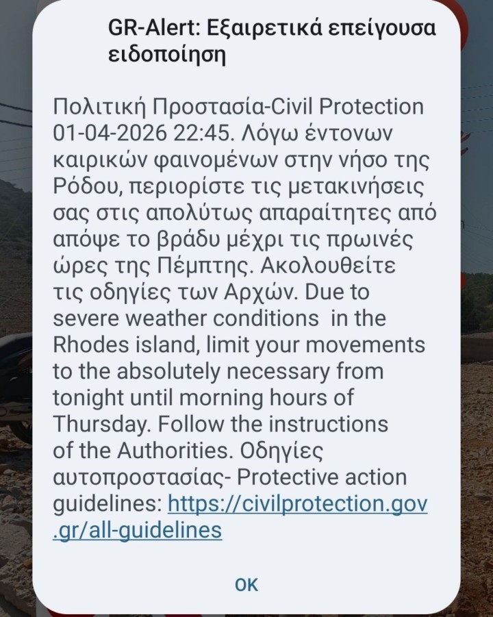Μήνυμα προειδοποίησης από το 112 εστάλη πριν από λίγα λεπτά στα κινητά τηλέφωνα χιλιάδων κατοίκων της Ρόδου, λόγω των έντονων καιρικών φαινομένων που βρίσκονται σε εξέλιξη στο νησί.