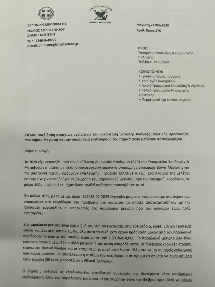 «Διαβιβάστηκαν αρμοδίως στοιχεία που αφορούν την κατάσταση έκτακτης ανάγκης πολιτικής προστασίας του δήμου Μεγίστης, καθώς και τα ευρήματα της υποβρύχιας επιθεώρησης του παραλιακού μετώπου Καστελλόριζου, προς το υπουργείο Ναυτιλίας και Νησιωτικής Πολιτικής, υπό τον υπουργό κ. Κικίλια.