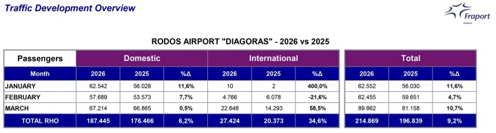Απολογιστικά, για τους τρεις πρώτους μήνες της νέας χρονιάς διακινήθηκαν μέσω του αεροδρομίου του νησιού 27.424 επιβάτες έναντι 20.373 πέρσι, καταγράφοντας αύξηση σε ποσοστό 34,6%, ενώ μαζί με την κίνηση στις γραμμές εσωτερικού διακινήθηκαν φέτος 214.869 επιβάτες έναντι 196.839 πέρσι το ίδιο διάστημα, με την αύξηση να διαμορφώνεται στο 9,2%.
