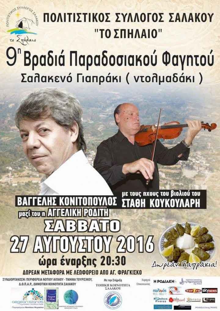 Διοργάνωση Πολιστικός Σύλλογος Σαλάκου «Το Σπήλαιο» και Τοπική Κοινότητα Σαλάκου, σε συνδιοργάνωση με την Περιφέρεια Νοτίου Αιγαίου, τον ΔΟΠΑΡ και υπό της Ομοσπονδίας Πολιτιστικών Συλλόγων Ρόδου.