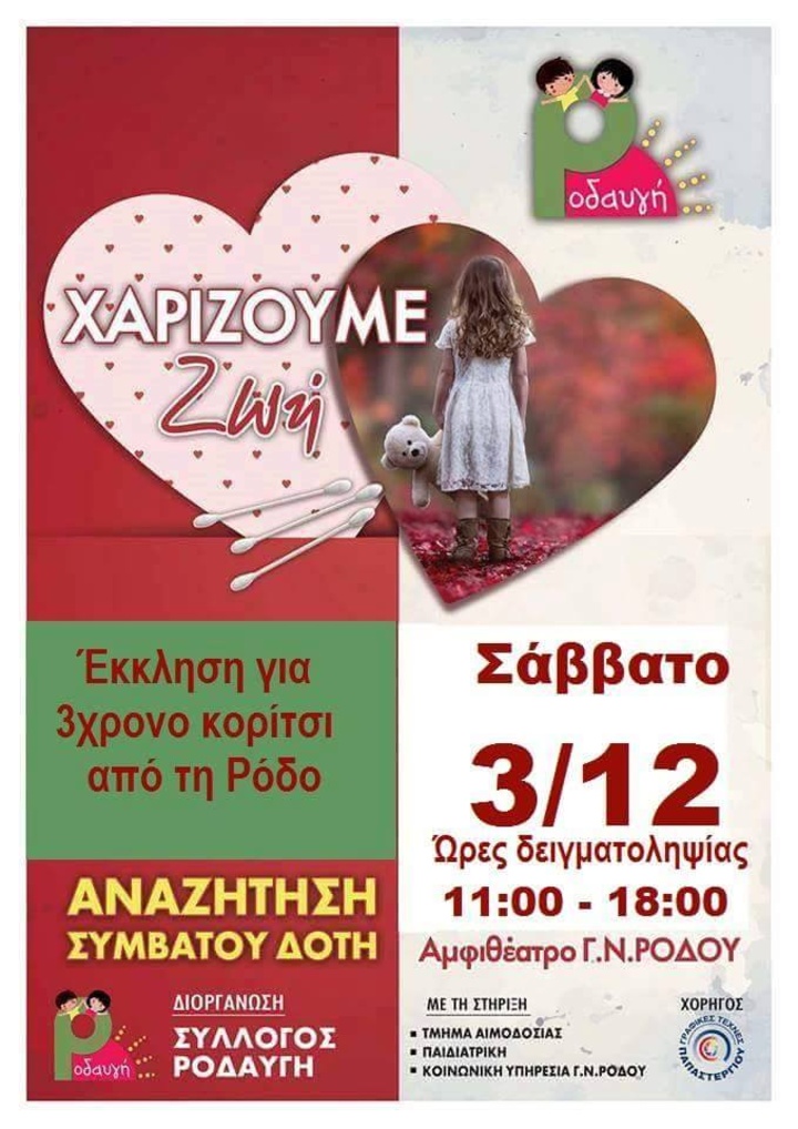Έκκληση προκειμένου να βρεθεί άμεσα δότης για ένα 3χρονο κοριτσάκι απο τη Ρόδο που πάσχει απο λευχαιμία και χρίζει μεταμόσχευσης μυελού των οστών, γίνεται απο τον Σύλλογο Ροδαυγή και το Γενικό Νοσοκομείο Ρόδου.