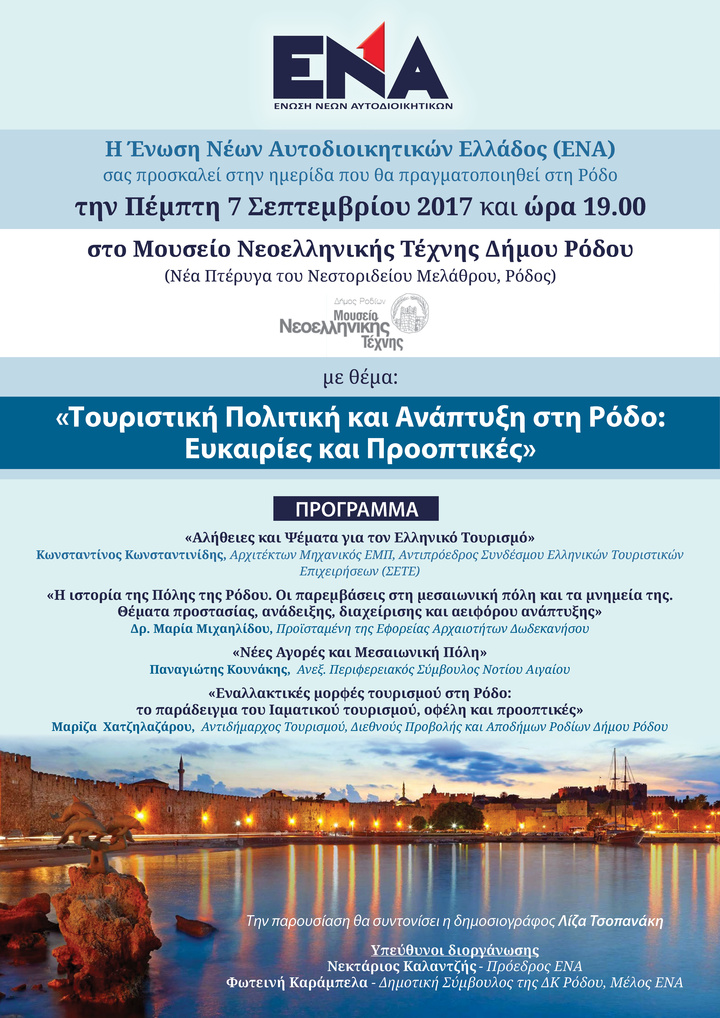 Η Ένωση Νέων Αυτοδιοικητικών Ελλάδος (ΕΝΑ) διοργανώνει ημερίδα που θα πραγματοποιηθεί στη Ρόδο την Πέμπτη 7 Σεπτεμβρίου 2017 και ώρα 19.00 στο Νεστορίδειο Μέλαθρον (Μουσείο Νεοελληνικής Τέχνης Δήμου Ρόδου, Νέα Πτέρυγα του Νεστοριδείου Μελάθρου, Ρόδος) με θέμα: «Τουριστική Πολιτική και Ανάπτυξη στη Ρόδο: Ευκαιρίες και Προοπτικές»