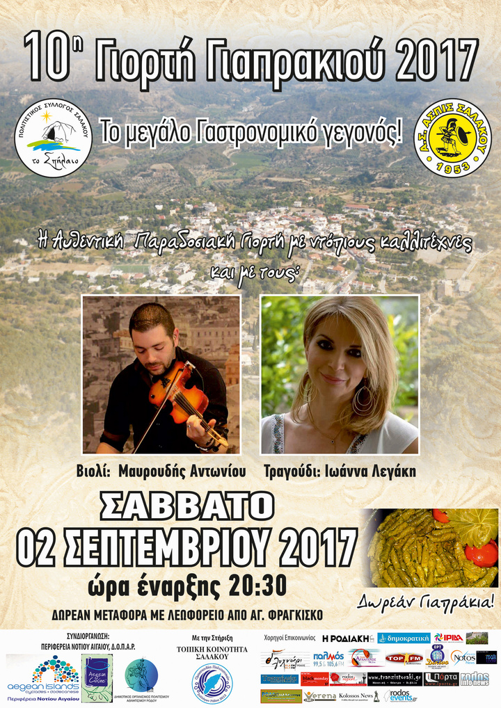 Η Περιφέρεια Νοτίου Αιγαίου, ο Πολιτιστικός Σύλλογος Σαλάκου ‘Το Σπήλαιο’, ο Αθλητικός Σύλλογος Σαλάκου και η τοπική κοινότητα Σαλάκου, συνδιοργανώνουν με τη στήριξη του ΔΟΠΑΡ και υπό την αιγίδα της Ομοσπονδίας Πολιτιστικών Συλλόγων Ρόδου, την «10η Γιορτή Γιαπρακιού 2017».