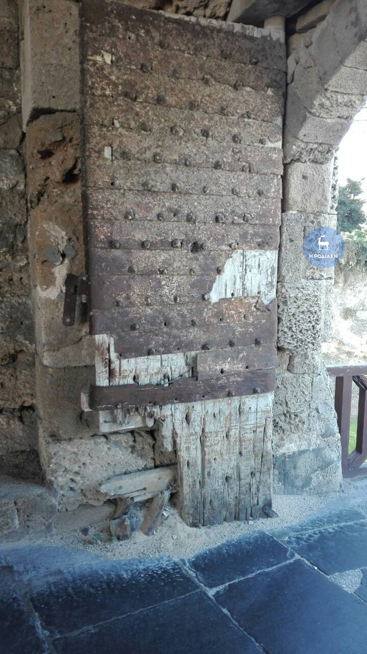 Όπως φαίνεται και στην φωτογραφία που δημοσιεύει σήμερα η "Ροδιακή", η μισή σχεδόν πόρτα έχει διαλυθεί και είναι έτοιμη να καταρρεύσει ενώ μάλιστα έχουν φύγει και μεγάλα κομμάτια ξύλου.