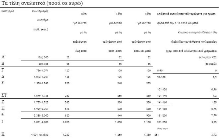 Ως γνωστό τα τέλη κυκλοφορίας χωρίζονται σε τέσσερις κατηγορίες ανάλογα με την παλαιότητα του οχήματος. Όσα έχουν ταξινόμηση από το 2010 και μετά τα τέλη υπολογίζονται με βάση τις εκπομπές διοξειδίου του άνθρακα (Co2) ανά χιλιόμετρο ενώ υπάρχουν διαφορετικά τέλη για τα παλαιότερα οχήματα που έχουν ταξινομηθεί ως 2000, την πενταετία 2001 -2005 και από το 2006 έως και το τέλος Οκτωβρίου του 2010.