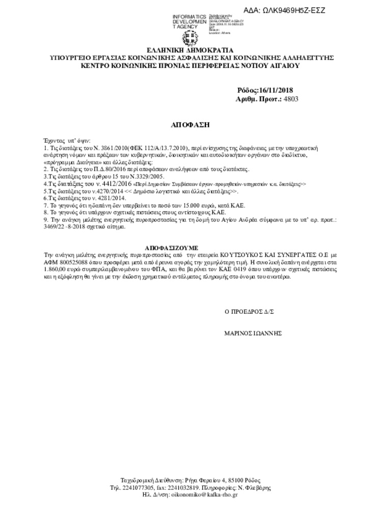 Συγκεκριμένα, σαας ενημερώνω ότι η ανάθεση της μελέτης ενεργητικής πυροπροστασίας της δομής του Αγίου Ανδρέα, του Κ.Κ.Π.Π.Ν.Α., ανατέθηκε στην εταιρεία που νομίμως εκπροσωπώ, το έτος 2018, δηλαδή δύο χρόνια πριν, επί κυβέρνησης ΣΥΡΙΖΑ και επί θητείας του προηγούμενου διοικητικού συμβουλίου των ιδρυμάτων. Η σχετική ανάθεση, έχει αναρτηθεί στο ΔΙΑΥΓΕΙΑ με ΑΔΑ: ΩΛΚ9469Η5Ζ-ΕΣΖ στις 16-11-2018. Η ανάθεση, έγινε κατόπιν διενέργειας συνοπτικού διαγωνισμού, που μετείχαν διάφοροι ενδιαφερόμενοι, στον οποίο νομίμως, προκρίθηκε η εταιρεία μου.