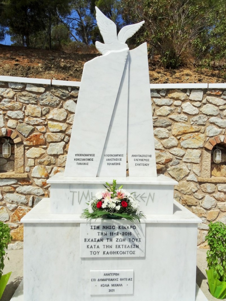 ευγνωμοσύνης και συνείδησης, στα τρία παλικάρια μας, τους ήρωες της Κινάρου και ολόκληρης της Χώρας που θυσιάστηκαν εν καιρώ ειρήνης, ασκούμενοι όμως σε συνθήκες πολέμου.