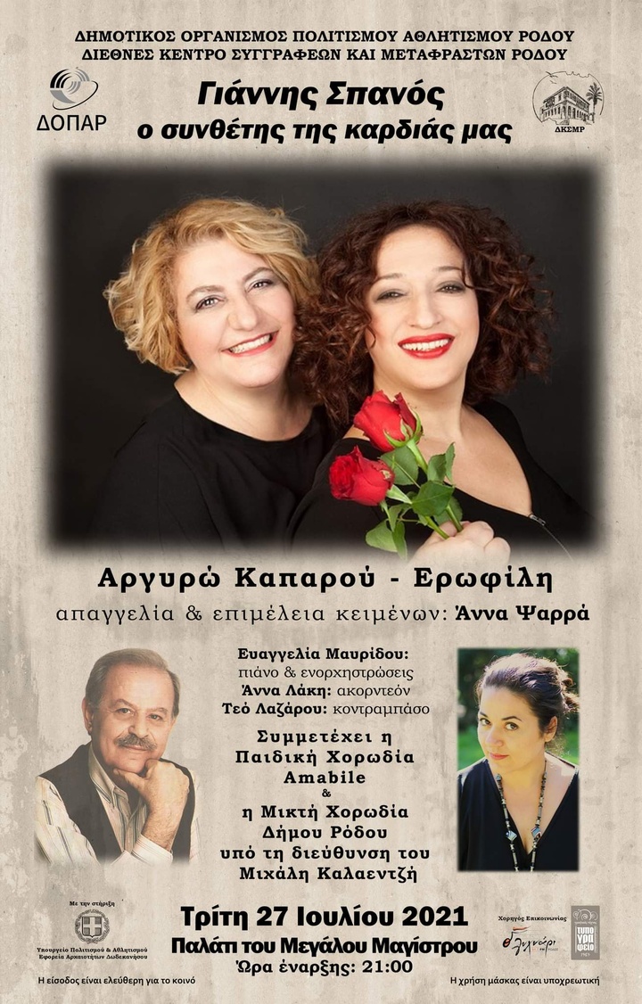 Το Διεθνές Κέντρο Συγγραφέων και Μεταφραστών Ρόδου-ΔΟΠΑΡ διοργανώνει μουσική παράσταση με τίτλο «Γιάννης Σπανός: Ο Συνθέτης της Καρδιάς μας» με τις σπουδαίες ερμηνεύτριες Αργυρώ Καπαρού και Ερωφίλη, την Τρίτη 27 Ιουλίου 2021 και ώρα 21.00 στο Παλάτι του Μεγάλου Μαγίστρου.