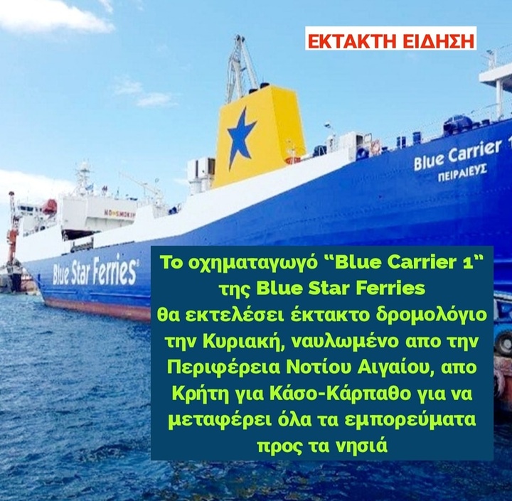 Με έκτακτη ανακοίνωσή του απόψε, ο περιφερειάρχης Νοτίου Αιγαίου κος Γιώργος Χατζημάρκος, ανακοίνωσε την πρωτοβουλία που πήρε η Περιφέρεια να ναυλώσει το οχηματαγωγό Blue Carrier 1 της Blue Star Ferries προκειμένου να εκτελέσει έκτακτο δρομολόγιο την Κυριακή.