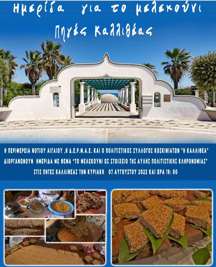 Για τον σκοπό αυτό, την επόμενη Κυριακή 7 Αυγούστου, στις 7 το απόγευμα θα πραγματοποιηθεί εκδήλωση στις Πηγές Καλλιθέας που θα περιλαμβάνει και ημερίδα με θέμα «Το μελεκούνι ως στοιχείο της Άυλης Πολιτιστικής Κληρονομιάς», κατά την οποία θα γίνει και η επίσημη ανακοίνωση έναρξης της προσπάθειας αυτής.