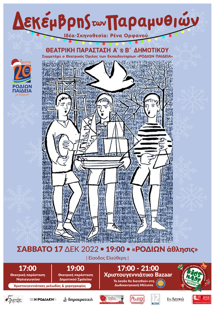 Η θεατρική παράσταση είναι βασισμένη σε μια ιδέα της εκπαιδευτικού θεάτρου των παιδιών, κ. Ρένας Ορφανού, η οποία έχει δημιουργήσει το κείμενο και έχει αναλάβει τη σκηνοθετική εμψύχωση της ομάδας. Στη «γιορτινή πλατεία» θα δώσουν το «παρών» ο θεατρικός όμιλος των Εκπαιδευτηρίων «ΡΟΔΙΩΝ ΠΑΙΔΕΙΑ» καθώς και τα μουσικά και χορευτικά σύνολα του Σχολείου.