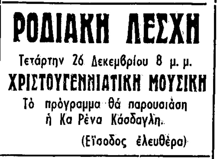 Εξ άλλου ανηγγέλθησαν ήδη διάφοροι εκδηλώσεις διά τους μεγάλους και διά τα παιδιά, αι οποίαι θα ποικίλουν την εορταστικήν ατμόσφαιραν της Ρόδου. Συγκεκριμένως, θα γίνουν σήμερον Ρεβεγιόν εις το Μαραμάρε, δύο χοροί, του Διαγόρα και του Δωριέως σήμερον και ένας παιδικός χορός σήμερον το απόγευμα εις την Λέσχην της Περιηγητικής. Σήμερον επίσης θα αρχίση τας παραστάσεις του επιθεωρησιακός θίασος, θα διεξαχθή ποδοσφαιρικός αγών μεταξύ ΠΑΟ-Διαγόρα και Αεροπορίας και το πρόγραμμα θα συμπληρωθή από τους 5 εν λειτουργία κινηματογράφους της Ρόδου.
