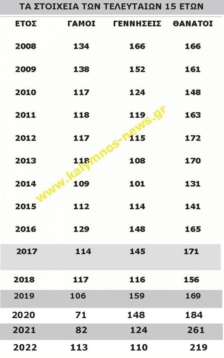 Δυστυχώς οι 219 θάνατοι το 2022, αποτελούν το δεύτερο αρνητικό ρεκόρ για το νησί της Καλύμνου τα τελευταία 15 χρόνια για τα οποία διαθέτουμε στοιχεία.