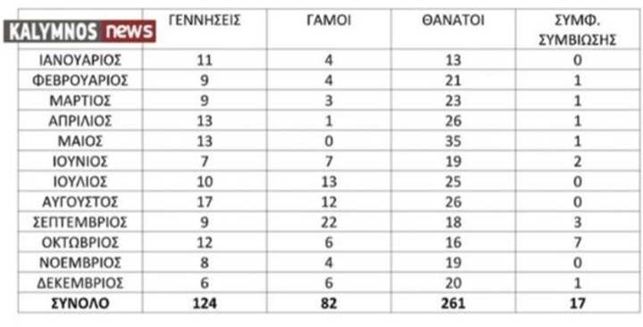 Σύμφωνα με το ρεπορτάζ του Kalymnos-news.gr το 2022 στην Κάλυμνο είχαμε 113 γάμους, 110 γεννήσεις και 219 θανάτους. Επίσης, υπήρξαν και 18 σύμφωνα συμβίωσης.