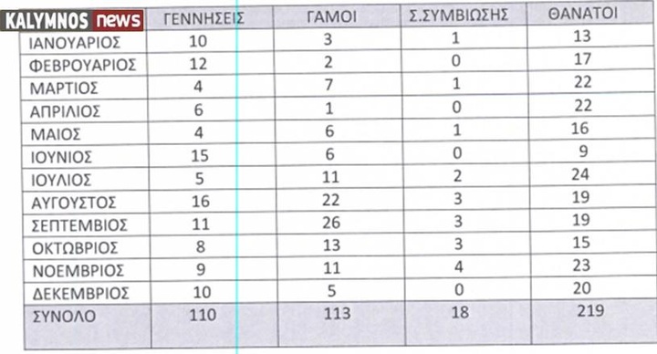 Αρνητικό ρεκόρ στο «ισοζύγιο» μεταξύ γεννήσεων-θανάτων στην Κάλυμνο το 2022, για μία ακόμα χρονιά. Οι γεννήσεις ήταν 110 ενώ οι θάνατοι σχεδόν διπλάσιοι 219.