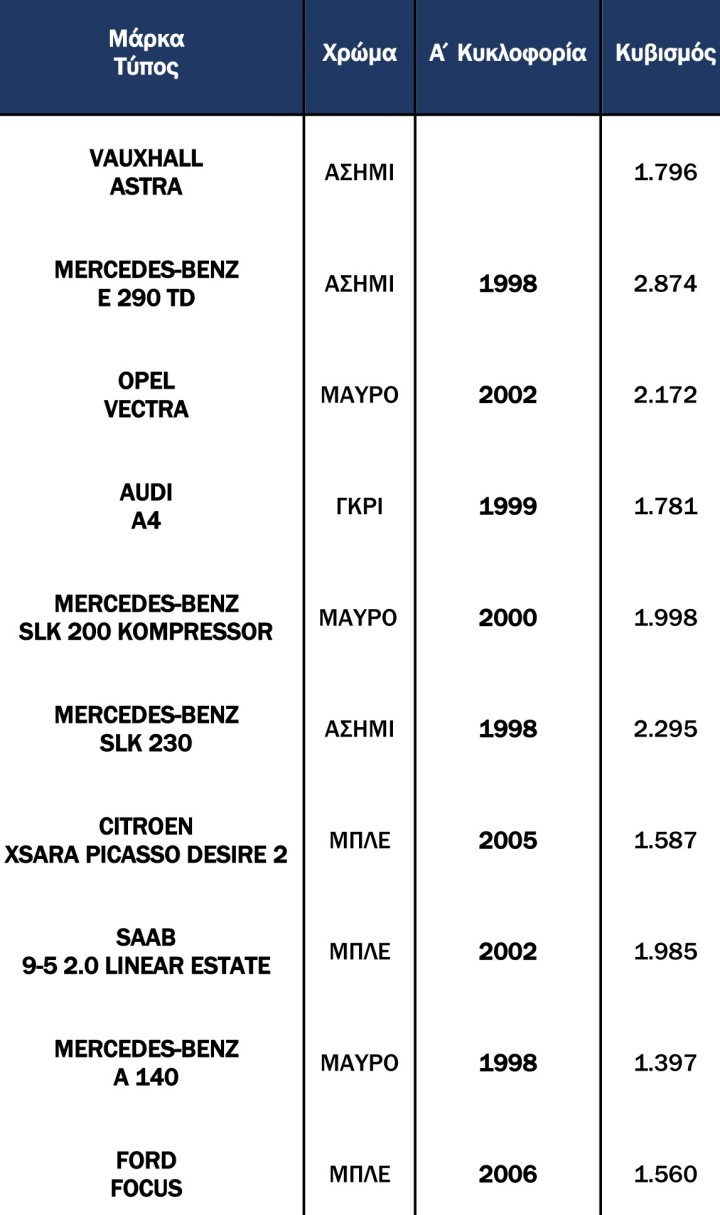 Η λίστα της νέας δημοπρασίας της ΑΑΔΕ απαρτίζεται από συνολικά 20 αυτοκίνητα προς κυκλοφορία, με τις τιμές τους να ξεκινούν από 440 ευρώ και να φτάνουν έως και τις 3.000 ευρώ.