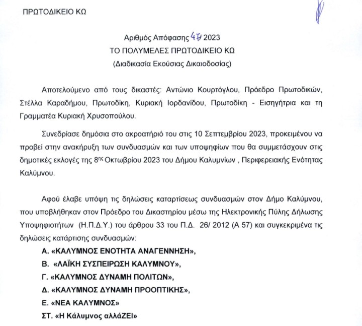 Συνεδρίασε δημόσια σήμερα Κυριακή 10 Σεπτεμβρίου 2023, το Πολυμελές Πρωτοδικείο Κω και προέβει στην ανακήρυξη των συνδυασμών που θα συμμετέχουν στις εκλογές της 8ης Οκτωβρίου 2023 στο Δήμο Καλυμνίων
