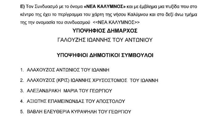 5.“ΝΕΑ ΚΑΛΥΜΝΟΣ” με υποψήφιο Δήμαρχο τον Ιωάννη Γαλουζή: 63 υποψήφιοι-ιες