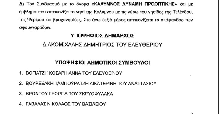 4.“ΚΑΛΥΜΝΟΣ ΔΥΝΑΜΗ ΠΡΟΟΠΤΙΚΗΣ” με υποψήφιο Δήμαρχο τον Δημήτριο Διακομιχάλη: 43 υποψήφιοι-ιες