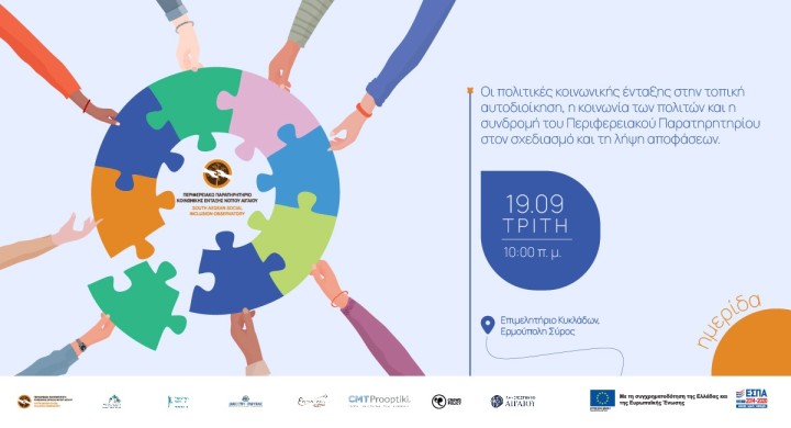 Το Περιφερειακό Παρατηρητήριο Κοινωνικής Ένταξης Νοτίου Αιγαίου και η εταιρεία τεχνολογίας Crowdpolicy διοργανώνουν ανοιχτή ημερίδα με θέμα: «Οι πολιτικές κοινωνικής ένταξης στην τοπική αυτοδιοίκηση, η κοινωνία των πολιτών και η συνδρομή του Περιφερειακού Παρατηρητηρίου στον σχεδιασμό και τη λήψη αποφάσεων», την Τρίτη 19 Σεπτεμβρίου και ώρα 10:00 π.μ. στο Επιμελητήριο Κυκλάδων.