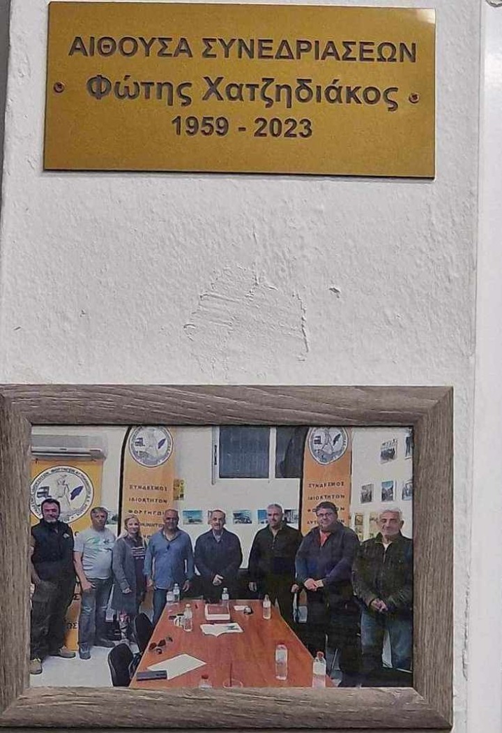 Ο Σύνδεσμος Ιδιοκτητών Φορτηγών Αυτοκινήτων Δημοσίας Χρήσεως μετά την ολοκλήρωση της γενικής τους συνέλευσης, που πραγματοποιήθηκε την περασμένη Κυριακή, προχώρησε σε ονοματοδοσία της αίθουσας συνεδριάσεων σε «αίθουσα συνεδριάσεων Φώτης Χατζηδιάκος».