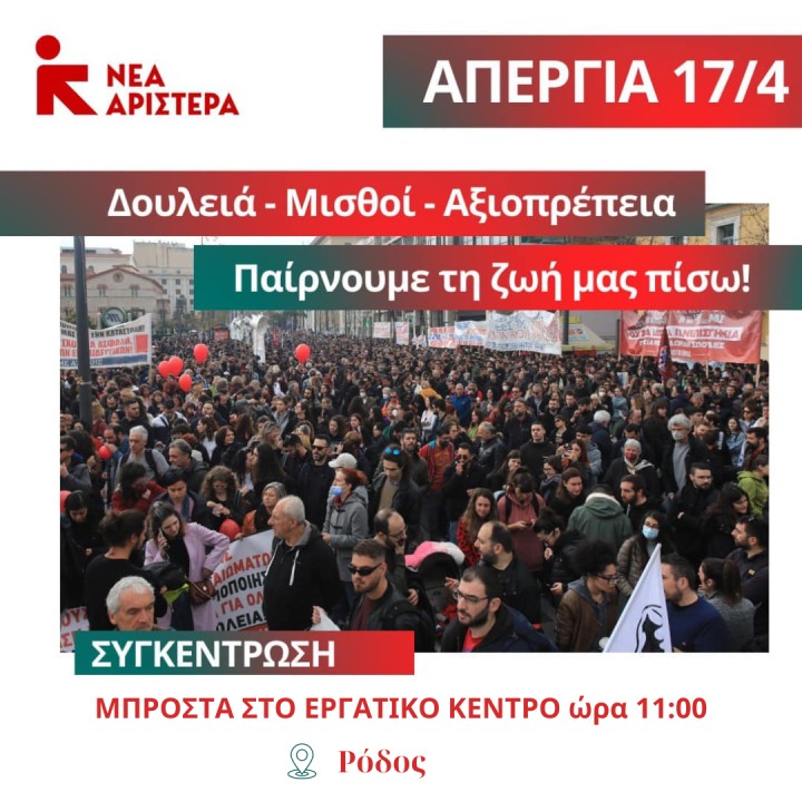 Στη Ρόδο, συμμετέχουμε στην απεργιακή συγκέντρωση, την Τετάρτη 17/4, στις 11:00, μπροστά στο Εργατικό Κέντρο."