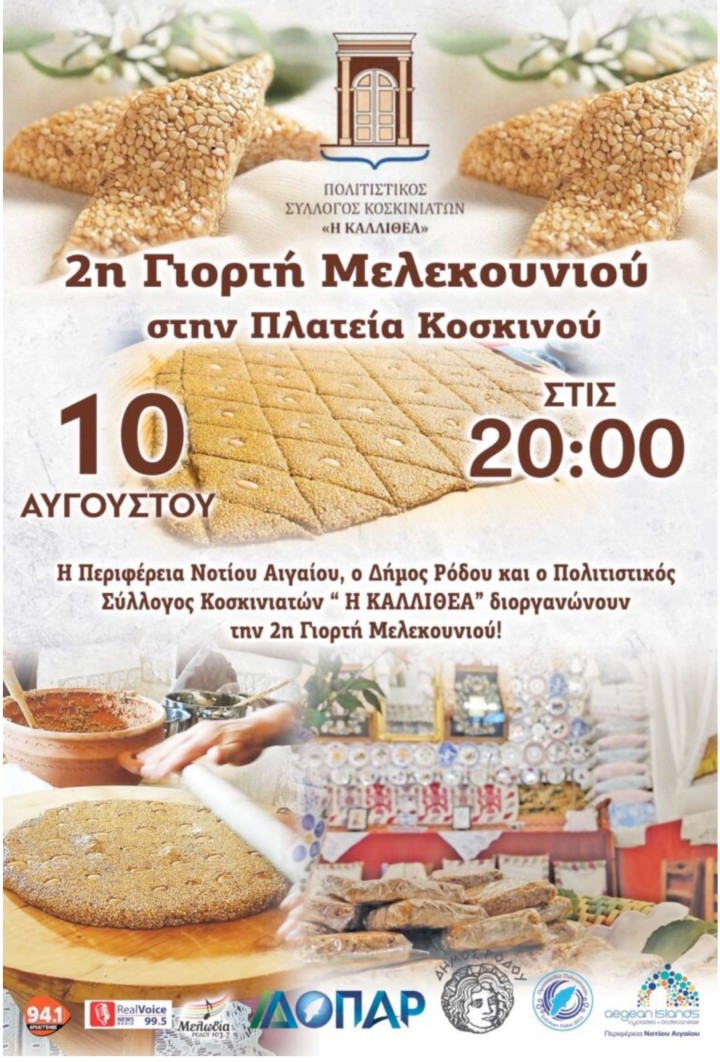Το Σάββατο 10 Αυγούστου και ώρα 8 το βράδυ, στην πλατεία Κοσκινού θα πραγματοποιηθεί η 2η Γιορτή Μελεκουνιού, που διοργανώνει ο Πολιτιστικός Σύλλογος Κοσκινιατών «Η Καλλιθέα», με τη στήριξη της περιφέρειας Νοτίου Αιγαίου και του ΔΟΠΑΡ.