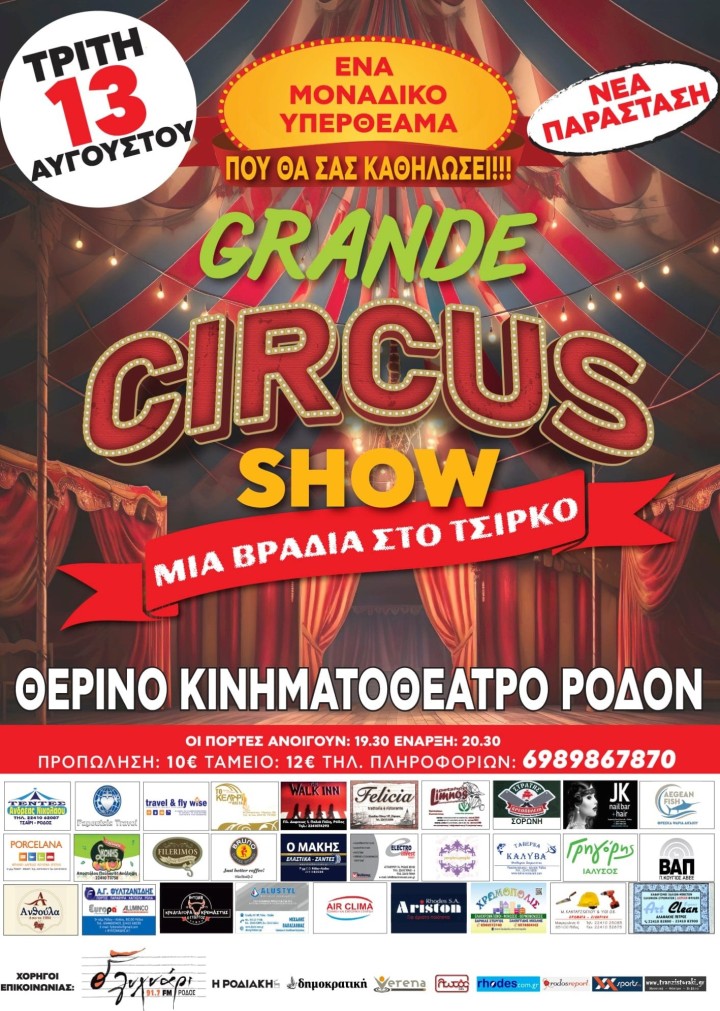 Η παράσταση GRANDE CIRCUS SHOW θα παρουσιαστεί ξανά, την Τρίτη 13 Αυγούστου στο θερινό κινηματοθέατρο «Ρόδον»!