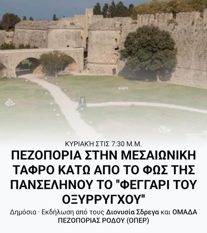 Η Ομάδα Πεζοπορίας Ρόδου (Ο.Π.Ε.Ρ.) αύριο, ημέρα Κυριακή 18/08/2024 διοργανώνει ένα μοναδικό δρώμενο πεζοπορίας εντός των τειχών του Κάστρου της Μεσαιωνικής Πόλης Ρόδου, σε ένα μαγευτικό ταξίδι πίσω στον χρόνο, όπου όπως αναφέρει «θα καταπλήξει κάθε περιπατητή συνταξιδιώτη που θα παρευρεθεί στην παρέα μας...».