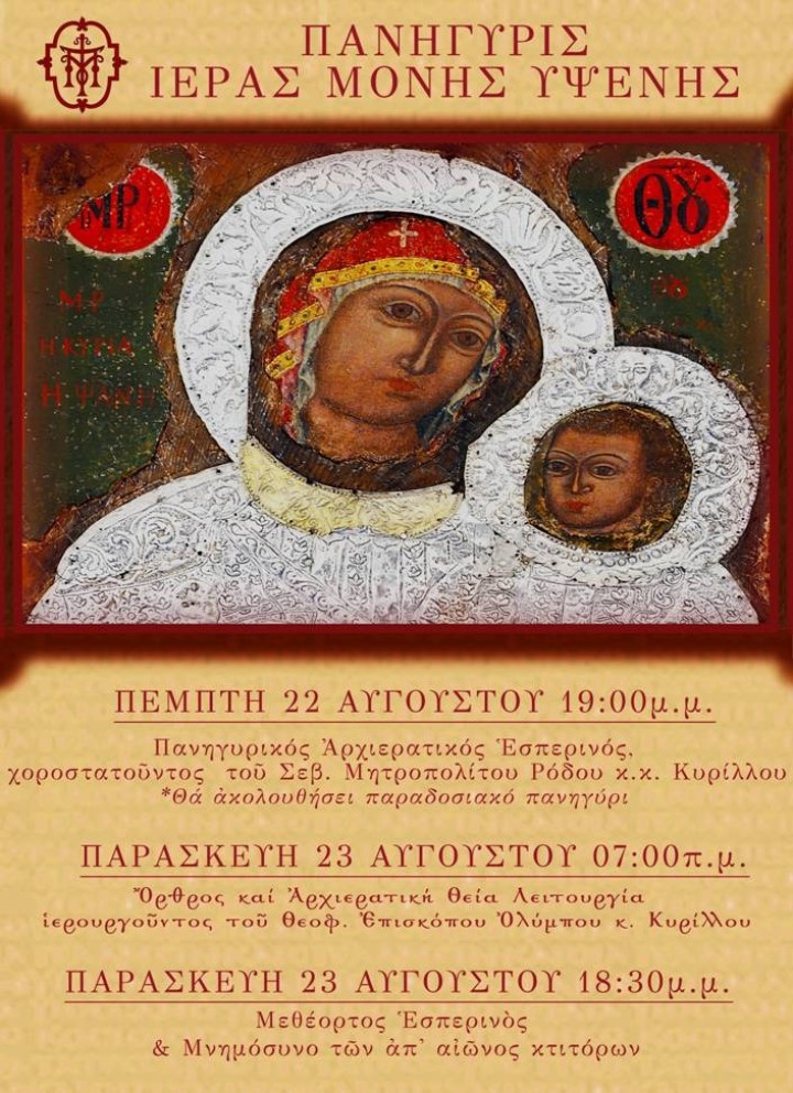 Η Ιερά Μονή Παναγίας Υψενής ανακοίνωσε το πρόγραμμα πανηγύρεως.