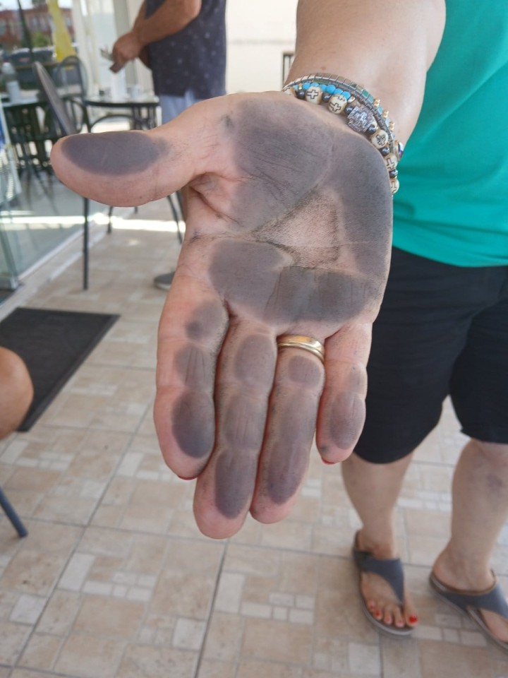 Ταυτόχρονα, καταγγελία ενάντια στη ΔΕΗ, κατετέθη στην Εισαγγελέα Ρόδου και από τις Κοινότητες Θεολόγου και Παραδεισίου. Η φωτογραφία είναι από τη Θολό. Είναι η ρύπανση από το εργοστάσιο της ΔΕΗ, που υπήρχε στις 11:00 το πρωί, πάνω σε τραπέζι που είχε καθαριστεί μόλις το ίδιο πρωί